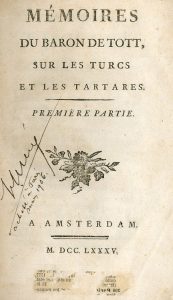 TOTT (Baron François de). Mémoires du baron de Tott, sur les Turcs et les Tartares. Amsterdam, sans édit., 1785, 4 parties en 2 vol. 8°, XL-203-[1 blanche], [4]-220 et [4]-180, [4]-152 p., demi-basane brune à coins de l'époque, dos lisses...