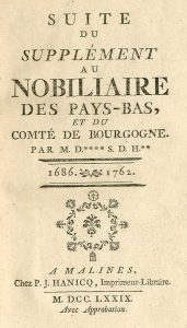 VEGIANO (J.C. DE, Seigneur DE HOVES).- M.D.**** S.D.H.**. Suite du Supplément au Nobiliaire des Pays-Bas et du comté de Bourgogne. Malines, P.J. Hanicq, 1779, 5 vol. in-12 : 1. 1555-1614 (241-[7] p.) ; 2. 1614-1630 (265-[3] p.) ; 3. 1630-1661...