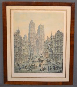 BRUXELLES.- Cathedral - Brussels. Drawn and engraved by John Coney. London, Moon Boys and Graves, January 1829. Belle gravure animée en coloris de la façade de la cathédrale St Michel (54 x 42 cm), sous passe-partout et cadre en bois.