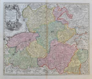 HOMANN (J.B.). Comitatus Hannoniae in suas quasque Castellanias Balliviatus [...]. Nuremberg, J.-B. Homann, 1725, carte en coloris de 54 x 62,5 cm (petite mouill. dans la marge inférieure).