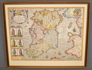 HONDIUS (d'après Jocondus). The Kingdome of Irland devided into severall provinces [...]. Newly described. 1610. Carte gravée en couleurs sous cadre en bois brun. Dim. : 45,5 x 55 cm.