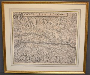 MEYER (Georg Friedrich). "Alsatiae Superioris et Inferioris Accuratissima Geographica Descriptio" [1677], carte sur double page in-folio, sous passe-partout et cadre doré. G.-Fr. Meyer (1645-1693, Bâle) est un arpenteur, géomètre et cartographe...