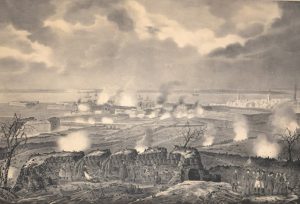 MONTIUS (Edouard). "Vue du Siège de la citadelle d'Anvers par l'armée française sous les ordres du maréchal Cte Gérard, et prise le 23 décembre 1832, après 24 jours de tranchées". Lithographie en noir montée sous cadre en bois. Brux., Impr....