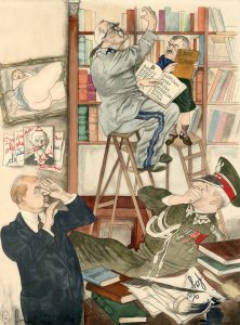 [Caricatures].- LECHON (J.). Marszalek Pilsudski. 13 karykaturach (13 caricatures en chromolithographie par Zdzislaw Czemanski, toutes protégées sous serpente). P., Librairie franco-polonaise et étrangère, 1931, in-folio (52 x 42 cm), en f.,...