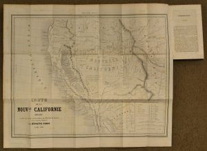 cartes, demi-veau blond de l'époque, dos lisse richement orné, pièce de titre maroquinée rouge (coiffes frottées, mors arrière fendu, petite déchirure sans perte de matière dans la marge blanche interne de la grande carte, rousseurs, cach. au faux titre). Deuxième édition, identique à la première et avec la même date, mais avec cette mention au haut de la grande carte. « The most complete and extensive work descriptive of California published in France at this time » (Cowan). Très rare.