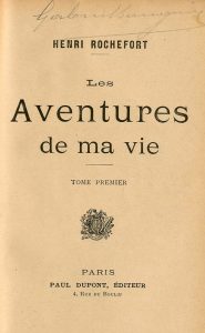 ROCHEFORT (Henri). Les Aventures de ma vie. P., Paul Dupont, [1896], 5 vol. in-12, XII-378, 385, 366, 391, 330 p., demi-toile brique à la Bradel avec coins, dos lisses, pièces de titre. Authentique aristocrate d'origine, Henri marquis de...