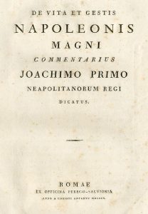 lég. bruniss.). Rare ouvrage sur la vie de Nnapoléon, rédigé en latin. L'auteur n'ayant pas les moyens d'éditer son 1er vol. c'est Napoléon qui finança la publication d'une centaine d'exemplaires seulement. Le 2e vol., destiné à contenir les commentaires de Joachim Murat, roi de Naples, ne parut jamais. Belle impression sur papier fort. L'ex. a conservé de grandes marges et est bien conservé. On joint une lettre autographe signée, datée de 1860, de Carlo Nocella (1826-1908), futur cardinal, adressée à Vincenzo Cavazzi, une partie du cachet de cire est conservée.