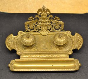 Encrier en cuivre de la seconde moitié du 19e s. avec deux encriers (sans les verres), tête de faune, chimère, angelots (18 x 29 cm).