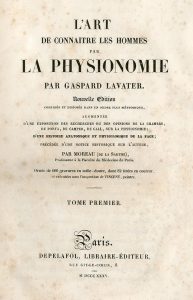 Chambre, de Porta, de Camper, de Gall, sur la physionomie ; d'une histoire anatomique et physiologique de la face ; précédée d'une notice historique sur l'auteur, par Moreau. Ornée de 600 [sic] gravures en taille-douce, dont 82 tirées en couleurs [en ocre]. Paris, Depelafol, 1835, 10 vol. 4°, t. 1 : [8]-419-1 blanche p., 32 h. t. (front., portr., 31, 2, 321, 4-10, 16, 11-15, 17-30) ; t. 2 : [4]-236 p., 71 h. t., dont 2 en 1 (33-47, 49, 48, 50-70, 72, 73, 75, 71, 74, 76-82, 84, 83, 85-103) ; t. 3 : [4]-292 p., 63 h. t. (104-112, 114, 113, 115-140, 142, 142-166) ; t. 4 : [4]-316 p., 26 h. t. dont 2 en 1 (167-184, 184 et 185bis, 186-191) ; t. 5 : [4]-320 p., 64 h. t., dont 2 en 1 (192, 192bis1, 192bis2, 192bis3, 194, 193, 195-205, 207-212, 214, 213, 206, 215, 217-223, 216, 251, 224-230, 230bis, 231-242, 250, 243-249 ; t. 6 : [4]-260 p., 95 h. t. (252-295, 296.1, 297.2, 298-339, 339bis, 340-345) ; t. 7 : [4]-278 p., 108 h. t. sur 109, manque la pl. 356 (346-355, 357-454) ; t. 8 : [4]-288 p., 71 h. t. (455-525) ; t. 9 : [4]-315-1 blanche p., 74 h. t. (526-537, 539, 538, 540-599), soit en tout 604 h. t. (sur 605), qq.-uns dépl., demi-chagrin tête de nègre de l'époque, dos lisses ornés de motifs dorés, titres et tomaisons dorés, têtes dorées (qq. traces d'usure, dos en partie très légèrement décolorés, coins émoussés, bruniss. à plusieurs p., dont les planches sont pour la plupart exemptes). Bon ex. de cette monumentale édition. Le "Lavater" s'inscrit dans la lignée de tous les grands ouvrages de physiognomonie parus jusqu'alors, il en est non seulement l'aboutissement scientifique (débarrassant la discipline de tout son fatras ésotérique) mais il brille par son illustration exemplaire (Lavater, ami de Fussli a particulièrement soigné les dessins). On sait l'importance qu'aura cet ouvrage, non seulement chez les écrivains comme Balzac, mais surtout sur les théories criminalistiques, et notamment sur Lombroso...