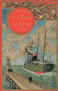 VERNE (Jules). De la terre à la lune. Voyage direct en 97 heures et 20 minutes. P., J. Hetzel et Cie, s.d., 4°, cartonnage polychrome édit., plat avant au steamer, tranches dorées (coins très lég. usés, qq. rousseurs).