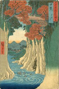 HIROSHIGE (1797-1858). Vues des 60 provinces (1853-1856). Format oban vertical. Marges coupées. Numéro 13 dans la série : le pont du singe dans la province de Kai (collection Claude Monet, n°. 142) et numéro 17 dans la série : le festival de...