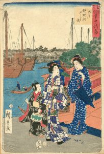 HIROSHIGE II (1826-1869). Femmes et enfant sur un quai. Estampe collée par les coins sur carton. Signature : Hiroshige. Dim. : 35 x 23,6 cm. Tirage tardif.