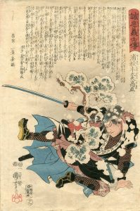 KUNIYOSHI (1797-1861). 47 ronins (Seichu gishi den : les samurai fidèles). Uramatsu Handayu Takanao tombant dans la neige (numéro 19). Contrecollée, légère pliure.