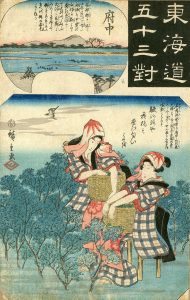 sauf une. 1. Hiroshige. Station numéro 21 (ou 20, selon la source) - Maruko ; 2. Hiroshige. Station numéro 8 - Hiratsuka Inage Saburo Shigenari ; 3. Hiroshige. Station numéro 18 - Hokitsu. Le poète Akahito sur la plage de Tago 4. Hiroshige. Station numéro 39 - Okazaki ; 4. Hiroshige. Station numéro 54-2 - Otsu ; 5. Hiroshige. Station numéro 47 - Kameyama. Le rêve d'Omatsu, l'épouse de Gennojo ; 6. Hiroshige. Station numéro 20 - Fuchu. Cueilleuses de thé (trois exemplaires : Contrecollée et de qualité identique aux autres, estampe complètement passée, estampe légèrement passée avec trous de vers) ; 7. Hiroshige. Station numéro 12 - Mishima ; 8. Hiroshige. Station numéro 49 - Sakanoshita. Le frère de l'empereur Tenchi ; 9. Hiroshige. Station numéro 48 - Seki. Le prètre Ikkyu et la courtisane Jigoku ; 10 Hiroshige. Station numéro 33 - Shirasuga ; 11. Hiroshige. Station numéro 37 - Akasaka.