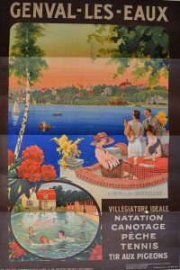 ANONYME. "Genval-les-Eaux" (1924). Lithographie en couleurs marouflée sur toile. Double cachet fiscal tamponné dans la partie infér. Brux., Impr. De Rycker, 1924, dim. affiche : 120 x 80 cm (lég. taches éparses, plis, pet. manque).