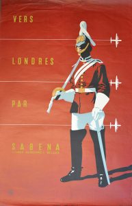 ANONYME. "Vers Londres par Sabena" (lignes aériennes belges). Lithographie en couleurs. Cachet fiscal au coin infér. gauche. Brux., Linsmô, (ca 1955), dim. : 100 x 64 cm (bord supér. froissé avec pet. déchirures, micro-manque angulaire).