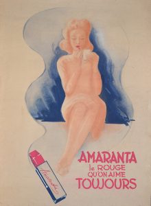 STERCKX (Suz.). "Amaranta, le rouge qu'on aime toujours" (1943). Projet d'affiche. Gouache, estompe et repères à la mine de plomb sur papier, datée et signée au coin infér. droit. Dim. support et sujet : 70,5 x 51 cm (papier défraîchi, trous...