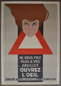 VAN ROOSE (Charles). "Ne vous fiez plus à vos oreilles, ouvrez l'oeil" (1936). Lithographie en couleurs pour la "Semaine de circulation du 23 au 29 mars 1936". Dim. : 86 x 60 cm (trous de punaise aux coins).