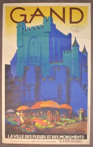 VERBAERE (Herman). "Gand - La Ville des fleurs et des monuments". Lithographie en couleurs. Gand, Colier et Gerondal, (ca 1935), dim. : 100 x 62 cm, cachet de l'Office belgo-luxembourgeois du tourisme (trous de punaise aux coins, 1 déchirure marg....