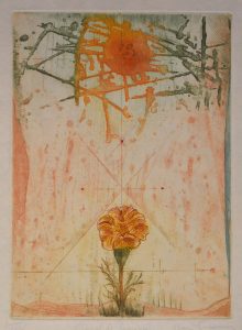 CARCAN (René). "Appel de lumière" (1976). Eau-forte et aquatinte originale en couleurs tirée sur Japon nacré, titrée, just. XIV/XV et signée au crayon. Dim. support : 57 x 38,5 cm ; sujet : 25 x 18 cm (René Carcan, Catalogue raisonné, 317).