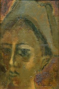 CHAPUT (Jean-Pierre). "Visage". Huile sur panneau, signée au coin infér. droit et montée sous cadre doré en bois. Dim. cadre : 42 x 31 cm ; support et sujet : 31 x 20,5 cm. Peintre d'origine française, né en Espagne en 1935, Jean-Pierre Chaput...