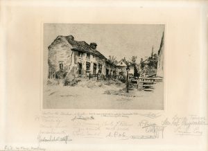 MORTIAUX (Henri). "Rue de la Pêcherie à Uccle". Eau-forte en noir tirée sur vélin crème, signée et dédicacée au crayon. Gravure contresignée au crayon par les artistes d'Uccle Centre d'Art : Claude Lyr, Kurt Peiser, Suzanne Cocq, Henri...