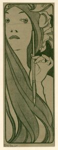 MUCHA (Alphonse). "L'Estampe moderne" (1897). Gravure monochrome, signée au coin infér. gauche et montée sous passe-partout et cadre en bois naturel. Dim. cadre : 52 x 25 cm ; sujet : 30 x 10 cm. Couverture (rognée) de la revue "L'Estampe...