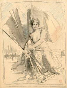 RASSENFOSSE (Armand). "La Victoire" (1916). Fusain, lavis et crayons de couleurs sur papier. Cachet-monogramme rouge au coin infér. droit. Dim. support et sujet : 28 x 21,5 cm.