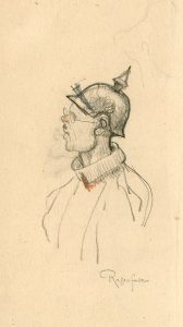 RASSENFOSSE (Armand). "Soldat allemand". Crayon gras sur papier, signé au coin infér. droit. Au verso : divers croquis. Dim. support et sujet : 16 x 9 cm.