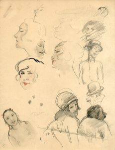 RASSENFOSSE (Armand). "Types féminins". Croquis au crayon gras rehaussé de couleurs, signé dans la partie infér. Dim. support et sujet : 32,56 x 25 cm. Une dizaine de croquis de femmes (et 2 hommes) éparpillés sur l'ensemble de la feuille.