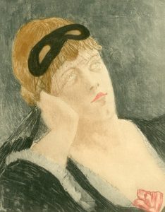 ROPS (Félicien). "La Femme au masque". Héliogravure en couleurs montée sous passe-partout et cadre doré en bois. Dim. cadre : 36,5 x 30 cm ; sujet : 19 x 14 cm (Exsteens, 931).