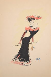SEM (Georges Goursat, dit). "Adèle Richir". Lithographie rehaussée de couleur à la main, titrée, signée dans la planche et montée sous cadre en bois doré. Dim. cadre : 53,5 x 37 cm ; support et sujet : 51 x 34 cm.