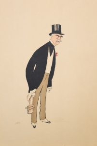 place difficile de chroniqueur attitré du Tout-Paris de 1900 ; il collabore régulièrement au « Figaro » et à « La Vedette », journal de Marseille. On le rencontre là où se regroupent les personnalités mondaines de cette époque : chez Maxim's, à Longchamp, à Deauville, dans les cercles et les casinos, son carnet de croquis à la main. Pour saisir ses victimes, il lui faut des mois d'affût secret, des dizaines de croquis qui se corrigent et se complètent. De là un extraordinaire rendu, non seulement des visages mais surtout de la démarche et de l'attitude de ses modèles" (http://www.universalis.fr/encyclopedie/georges-goursat-dit-sem).