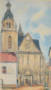UTRILLO (Maurice). "L'Eglise de Limours" (1928). Aquatinte en couleurs tirée sur papier vélin, datée, signée dans la planche et montée sous passe-partout et cadre doré en bois. Gravure d'interprétation réalisée par Jacques Villon. Tirage de...