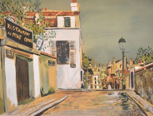 UTRILLO (Maurice). "Restaurant Au Mont Cenis" (1922). Lithographie d'interprétation en couleurs, rehaussée au pochoir, datée, signée dans la planche et montée sous passe-partout de toile grise et cadre doré en bois. Dim. cadre : 61,5 x 75,5 cm...