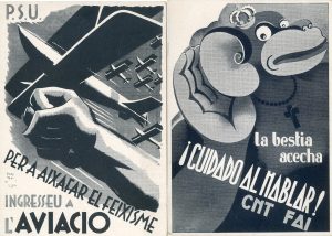 Cartes postales.- Guerre civile espagnole. 16 cartes reproduisant des affiches de propagande pour la république espagnole. On joint un petit carnet contenant des reproductions photographiques de bombardements et de ruines causés par les...