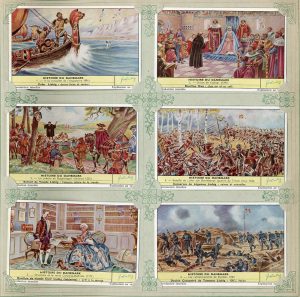 Chromos Liebig.- Album de 50 séries (soit 300 chromos) relatives à l'histoire des pays et des provinces./ Album de 46 séries (soit 276 chromos) relatives à la mythologie, aux légendes, biographies d'hommes célèbres.../ Ens. 2 pièces.