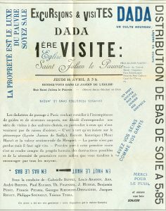 visites à travers Paris de lieux volontairement dérisoires auxquelles est convié le public : " Les dadaïstes de passage à Paris voulant remédier à l'incompétence de guides et de cicerones suspects, ont décidé d'entreprendre une série de visites à des endroits choisis, en particulier à ceux qui ont vraiment pas de raison d'exister. - C'est à tort qu'on insiste sur le pittoresque (Lycée Janson de Sailly), l'intérêt historique (Mont Blanc) et la valeur sentimentale (La Morgue). - La partie n'est pas perdue mais il faut agir vite. - Prendre part à cette première visite c'est se rendre compte du progrès humain, des destructions possibles et de la nécessité de poursuivre notre action que vous tiendrez à encourager par tous les moyens".