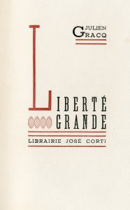 GRACQ (Julien). Liberté grande. Frontispice par André Masson. P., Corti, 1946, in-12, plein chagrin bordeaux, dos lisse, titre doré, tête dorée, étui gainé et bordé de même, couv. et dos cons., non rogné (dos éclairci). Edit. orig. 1/23...
