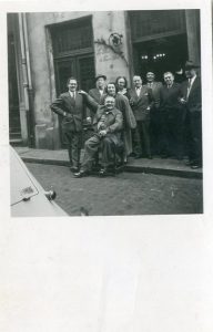 Surréalisme belge. Photo originale prise devant le bistrot "La Fleur en papier doré" de Van Bruaene (assis sur une chaise) entouré de Marcel Mariën, Camille Goemans, E.L.T. Mesens, Scutenaire et Irène Hamoir, Magritte et sa femme, Collinet....