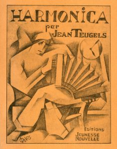 TEUGELS (Jean). Harmonica. Brux., Edit. de La Jeunesse nouvelle, 1923, in-12 carré, 1er plat de couv. ornée d'un dessin cubiste. Edit. orig. tirée à petit nombre. Envoi : "pour [E.L.T] Mesens cette musique de crécelle. Jean Teugels".