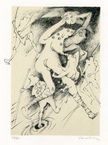 CHAVEZ.- MANSOUR (Joyce). Trous noirs. Illustrations de Gerardo Chavez. Brux., La Pierre d'Alun, 1986, 8°, en f., couv. Edit. orig. 1/50 ex. de tête destinés aux amis de "La Pierre d'Alun" enrichis d'une lithographie originale num. et signée par...
