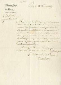 d'Estournel (1744-1823), promu maréchal de camp en 1784, membre de l'assemblée des notables en 1787, grand-bailli de la noblesse du Cambrésis, élu député aux États généraux par la noblesse. Après la séparation de l'Assemblée constituante en 1791, il est nommé inspecteur général des armées et promu général de division le 6 févr. 1792. Il est accusé par Adam Philippe Custine d'avoir mal interprété ses ordres, est emprisonné quelques semaines, mais réussit à se justifier. Le 2 vendémiaire de l'an XIV, le Sénat conservateur l'élit député de la Somme au Corps législatif. Le 21 sept. 1808, il est créé chevalier de l'Empire, et, le 4 mai 1811, réélu, par le Sénat conservateur, député de la Somme. Il fait encore partie de cette Assemblée en 1814 et il adhère à la déchéance de l'empereur. Lettre datée de Paris le 18 janv. 1815, 1 p. 4° à en-tête de la Chancellerie de France. « Monsieur le Marquis, J'ai reçu avec votre lettre du 17 de ce mois, l'exemplaire du recueil des opinions émises par vous à l'assemblée constituante et de vos comptes rendus. Je vous remercie de l'envoi de ces écris [sic] que je conserverai avec soin dans ma Bibliothèque et qui ne m'était pas nécessaire pour me faire apprécier votre conduite dans ces tems mémorables. »/ QUINETTE, Nicolas-Marie, baron de ROCHEMONT (1762-1821), homme politique français. Quinette reçoit la charge de conseiller d'État en 1810 et de directeur général de la comptabilité des communes la même année. À ce poste, il travaille à la rédaction d'un tableau général de la comptabilité des grandes villes de l'Empire, qu'il présente en 1813 ainsi qu'un résumé du budget de toutes les communes. Il adhère en 1814 à la déchéance de Napoléon puis se retire aux environs de Paris. Lettre manuscrite avec signature autographe au marquis Louis-Marie d'Estournel, datée de Paris le 8 juin 1813, 2 p. 4° à en-tête ms. du « Cabinet particulier du Directeur général ». Quinette répond à 2 lettres de son correspondant, l'une à propos du clocher de l'église de Daon (Mayenne) et l'autre à propos de l'Hospice de Bray (Seine-et-Marne)./ Ens. 2 lettres.