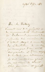 le « Moniteur universel », collaborateur à de nombreuses revues, qui entretint une correspondance avec Charles Baudelaire, le 8 déc. 1882, 2 p. 8°. Lettre de recommandation à son ami pour « Mr [Noël ?] Duhamel, graveur », dont il « apprécie très sincèrement le talent et qui te soumettra des échantillons de son travail qui témoignent [...] d'une souplesse de talent ».