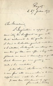 Ragats (Suisse) le 27 juill. 1875, 1 p. et 3 lignes 8° sur papier à en-tête du « Camden Place. Ghislehurst ». « L'Impératrice [Eugénie] a appris que vous étiez très souffrant et que votre santé réclamait de très grands soins. Si l'air de la Suisse pouvait contribuer à la rétablir, Sa Majesté me charge de vous dire qu'elle vous offre l'hospitalité pendant un mois à Arenenberg [château situé au bord du lac de Constance à Salenstein, dans le canton de Thurgovie en Suisse, dernière demeure de la reine de Hollande Hortense de Beauharnais, mère de Napoléon III, où séjourna plusieurs fois la Princesse Eugénie avant d'en faire don] et qu'elle serait heureuse que vous puissiez vous rendre à son invitation. » Etc. Peu commun.