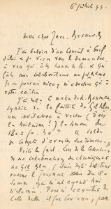 Bruxelles le 6 juill. 1899, 4 p. in-12. Très intéressante lettre où l'écrivain demande conseil après avoir « reçu ce matin de M. Goumer [?], syndic de la faillite du Gil Blas, une invitation à verser (dans la huitaine !) la somme de 1802 fr. 30 c. 'solde de compte d'avance sur romans' ». Il explique longuement les circonstances, parle de son entrée au « Journal » de Xau, de livres (« L'Homme en amour », « Adam et Ève »…) et termine : « Vous m'obligeriez infiniment mon cher Jean Bernard en me donnant sans tarder votre sentiment. La question a dû être résolue déjà par les tribunaux. » Belle et longue lettre à déchiffrer...