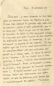 enveloppe adressée à Richard Heyd datée du 20 avr. 1949 joint. Martin du Gard remercie vivement son correspondant pour l'envoi des vol. du « Théâtre » d'André Gide (Neuchâtel, Îdes et Calendes). Il compatit à ses tracas et lui demande des nouvelles. Il parle ensuite de Jacques Copeau et de Gide : « La mort de Jacques Copeau nous prive d'une exceptionnelle amitié. Nous avons fait le voyage de Pernaud, pour assister aux obsèques. Les rangs de ma génération s'éclaircissent... À qui le tour ? J'ai revu là-bas bien des visages d'autrefois, que les années n'ont pas épargnés, et qui m'ont durement rappelé que la vieillesse est là, et que notre temps est compté... / Gide est rentré à Paris depuis la fin d'octobre. Il ne pensait y faire qu'un court séjour, mais ses projets d'hivernage étaient vagues. Je redoute pour lui le froid, les tentations et les fatigues de Paris ! Il ne va pas mal, mais il lui faudrait une vie au ralenti, un climat doux, de grandes précautions. Le moindre effort le met sur le flanc, et il est perpétuellement sous la menace d'une nouvelle crise, qui pourrait être mortelle ».