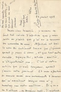 directeur de 1922 à 1936, datée de Bellême (Orne) le 22 juill. 1925, 4 p. 8°. Après avoir rappelé durant 2 p. son affection (« Affection est bien le nom du sentiment tenace que j'éprouve quand je pense à vous, et que tout autre vocable, sympathie, estime, amitié, n'étiquerait pas... C'est à votre article que je vais toujours, quand j'ouvre votre journal »...), Roger Martin du Gard parle de Gide : « Gide est parti. Pour moi, naturellement, ses 'Faux-Monnayeur' sont le meilleur de ses romans. Mais, contrairement à ce que l'on éprouve d'ordinaire pour les grands auteurs, quand on connait l'homme comme je le connais maintenant, on le préfère encore à ses oeuvres, même les plus solides. Aussi je suis mauvais juge. » Il parle ensuite des travaux dans sa propriété de famille où il s'installe, de Mme Boyd, sa traductrice...