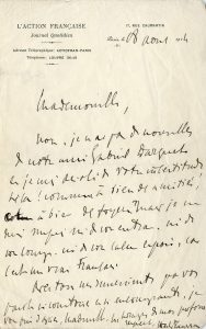 MAURRAS, Charles (1868-1952), journaliste, essayiste, homme politique et poète français, théoricien du nationalisme intégral. Lettre autographe signée à une « Mademoiselle », datée de Paris le 18 août 1914, 1 p. 8°, en-tête de «...