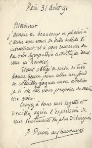 plaisir à causer avec vous de votre article si intéressant, et à vous remercier de la vive sympathie artistique dont vous m'honorez. / Étant obligé de sortir de très bonne heure pour aller au fond de Neuilly gagner mon atelier je n'ose pas vous proposer de venir me voir. » Etc.